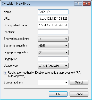 - CA-Distinguished-Name: The standard name under which the CA is entered, e.g. /CN=LANCOM CA/O=LANCOM SYSTEMS/C=DE
