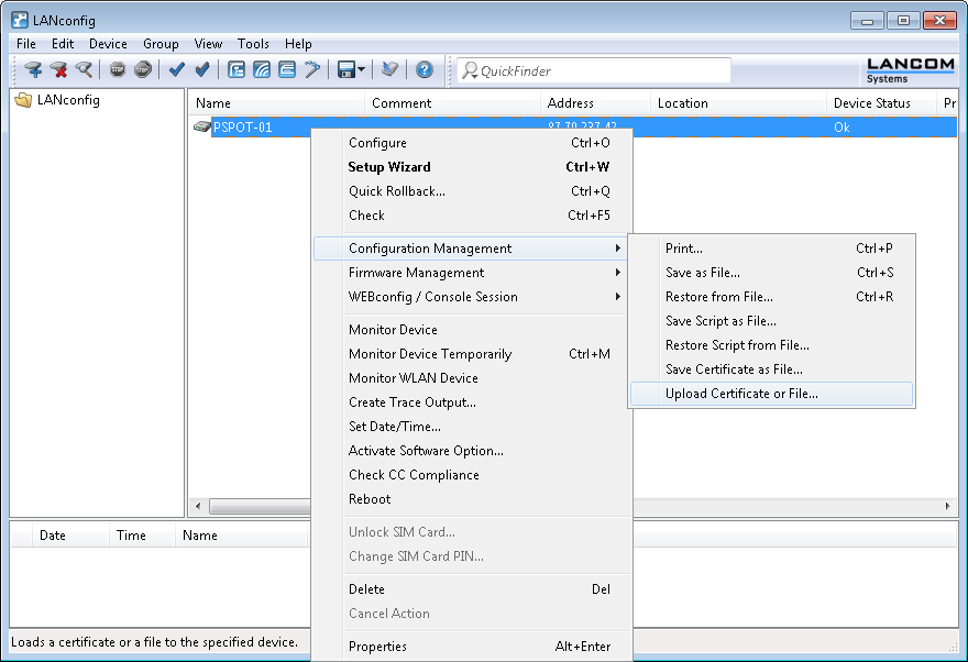 The certificate is loaded into the device for using LANconfig in File Management to upload the individual files of the root CA certificate or a PKCS#12 container: