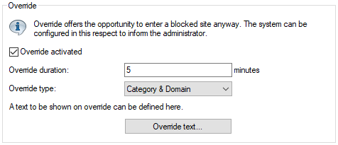 - The override duration can be restricted here. When the period expires, any attempt to access the same domain and/or category will be blocked again. Clicking on the override button once more allows the web site to be accessed again for the duration of the override and, depending on the settings, the administrator will be notified once more.