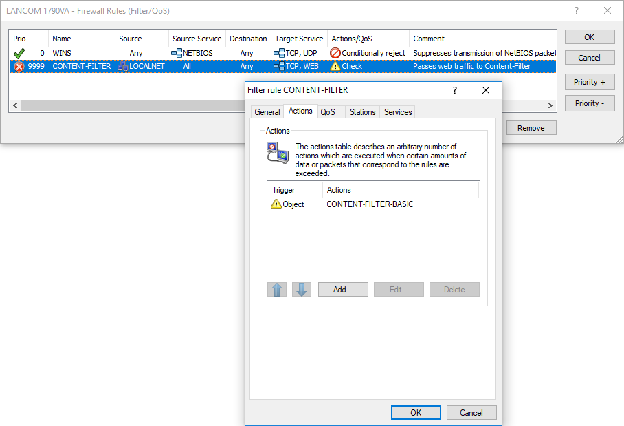 A content-filter related firewall rule must contain a special action object that uses packet actions to check the data according to a content-filter profile. In the default configuration you will find the action objects CONTENT-FILTER-BASIC, CONTENT-FILTER-WORK and CONTENT-FILTER-PARENTAL-CONTROL, each of which refer to their corresponding content-filter profile: