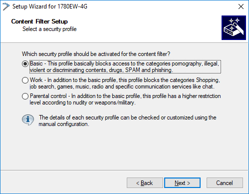 - Select one of the predefined security profiles (Basic Profile, Corporate Profile, Parental Control Profile):