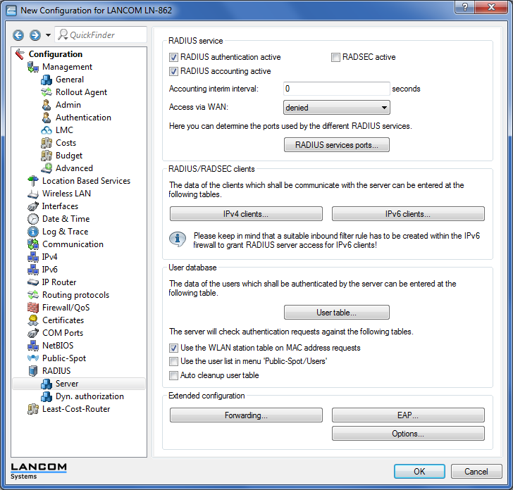 In order for the WLAN controller to forward authentication requests from internal users to the external RADIUS server, suitable entries must be made in the forwarding settings.