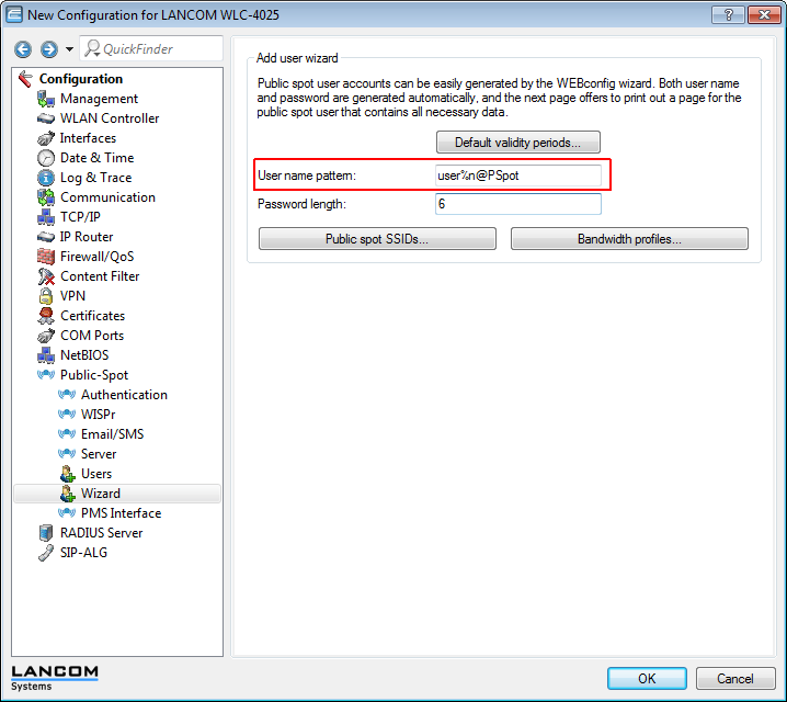 For example, if the pattern is "user%n@PSpot", the Public Spot generates usernames with the format "user12345@PSpot".
