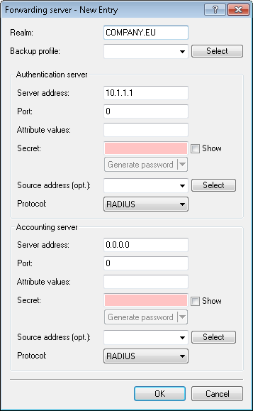 All incoming RADIUS requests which have the realm "COMPANY.EU" will be forwarded to the specified IP address.