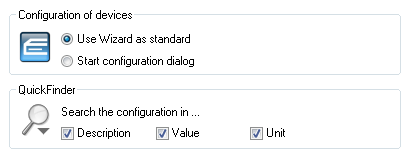 - You can decide that the Setup Wizard should be used by default when carrying out a configuration or that the manual configuration dialog should be opened when you double-click on a device. In the default setting the Setup Wizard starts when a device is double-clicked.