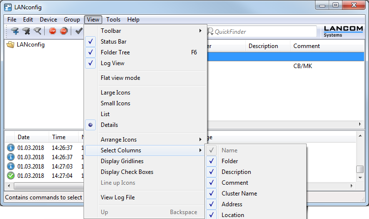 As a help for large-scale projects, LANconfig provides a better overview and quicker orientation with its columns featuring device-related details that can be shown or hidden according to your needs. Choose the columns to be displayed from . The menu item allows you to sort the items as you prefer.