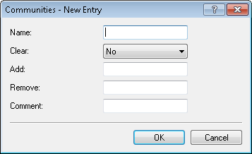- Specifies which communities the device adds to an NLRI. Communities are specified by means of a comma-separated list (<AS-number1>: <Value1>,<AS-number2>:<Value2>,<AS-number3>:<Value3>).