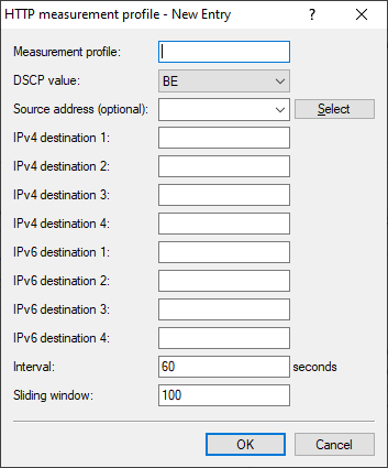 HTTP measurement profiles specify a parameter set used by measurements that are based on HTTP(S) connections. Interface metrics are derived from measurements that quantify the connection quality. These metrics are: Mean time to establish an HTTP(S) connection (latency), jitter, and connection-error rate (packet loss).