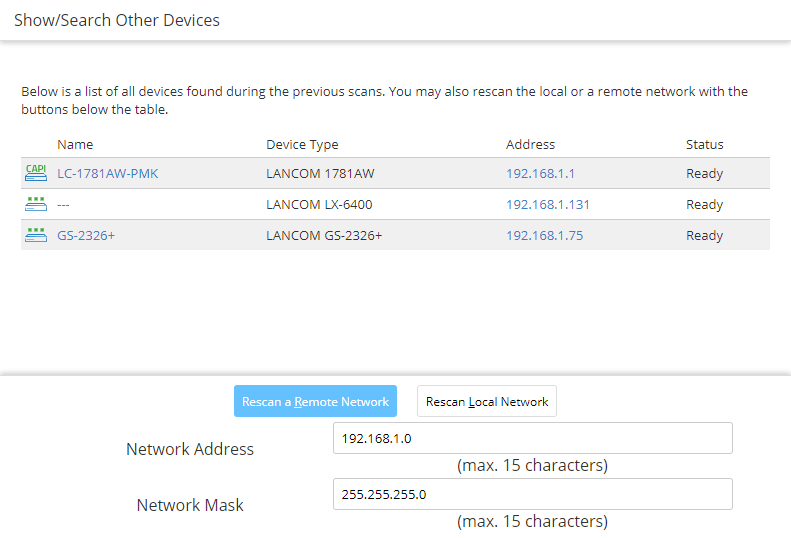 Using the Show/Search function, you can search for other devices in your network and switch directly to the configuration page of the found devices via a corresponding link. This function is similar to the Find devices option in LANconfig.