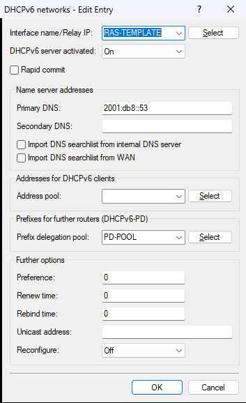 "RAS-TEMPLATE". Set the option DHCPv6 server activated to "On". Under Primary DNS, configure which IPv6 DNS server address is to be