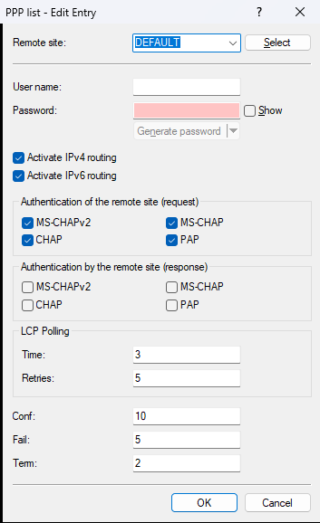 Leave the name of the Remote site as "DEFAULT". This entry is used for all PPPoE clients that are to be