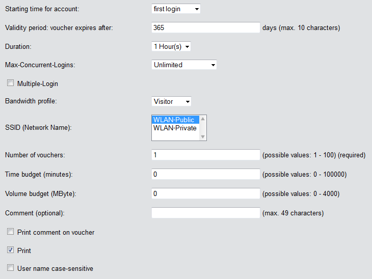 The wizard automatically creates a username and a password. In the subsequent printout dialog you can select the voucher printer and print-out the voucher.