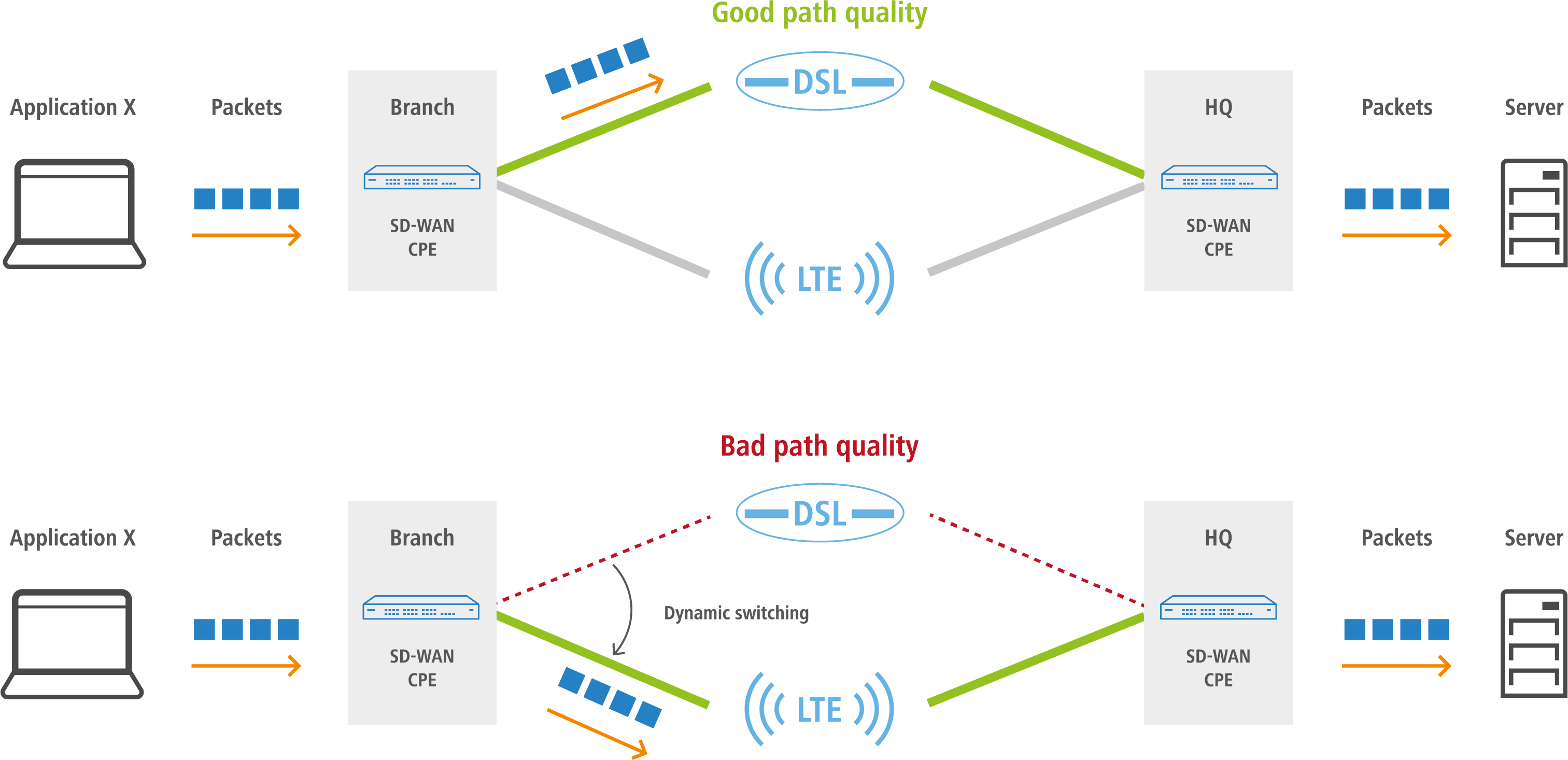 Used in an SD-WAN scenario where several lines are available, Dynamic Path Selection (DPS) optimizes the performance of an application by directing data traffic over the line with the best quality as rated by metrics such as load, packet loss, latency or jitter.