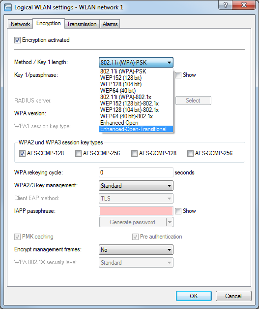 The WLAN to be used for the hotspot is set up in the usual way with the exception that the encryption method is set to Enhanced Open Transitional:
