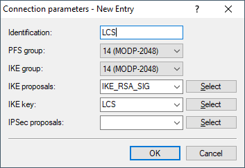 Finally, the VPN connection parameters must be set up to use the correct IKE proposals ('IKE_RSA_SIG'). The values for 'PFS group' and 'IKE group' must agree with the values set in the IKE connection parameters.