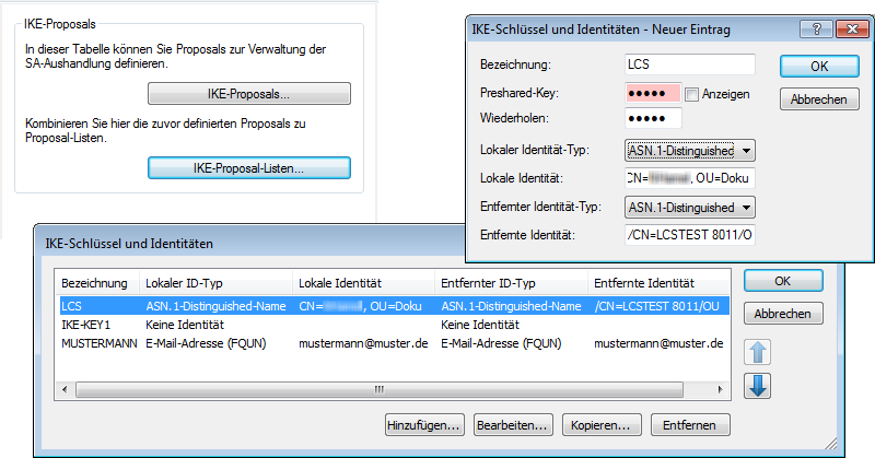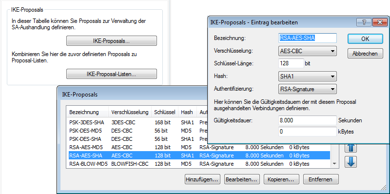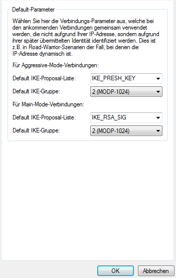 Important: Microsoft Windows displays some values in the certificates with outdated abbreviations, such as ‘S’ instead of ‘ST’ for 'stateOrProvinceName', or ‘G’ instead of ‘GN’ for ‘givenName’. In these cases make sure that you use the current abbreviations 'ST' and 'GN'.Note: Special characters in the ASN.1 Distinguished Names can be entered by typing in the hexadecimal ASCII codes after a leading backslash. For example, "\61" corresponds to a small "a". - In the IKE connection parameters, the default IKE proposal lists for incoming aggressive-mode and main-mode connections must be set to the proposal list 'IKE_RSA_SIG'. Also observe the settings in the default IKE group which are adjusted in the following step as necessary.