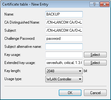 - Subject: Specification of the primary WLAN controller's MAC address in the form: /CN=00:a0:57:01:23:45/O=LANCOM SYSTEMS/C=DE