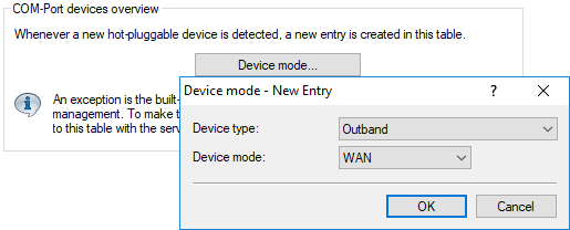 The serial interfaces in the device can be used for various applications, for example for the COM port server or as a WAN interface. The Devices table allows individual serial devices to be assigned to certain applications. As soon as a HotPlug-capable USB adapter is detected, a new entry for the serial interface provided by this USB adapter is created automatically in this table. This automation simplifies the configuration of the serial devices. An exception is the built-in serial interface, which is used for configuration purposes as standard. Entries can be added to the Devices table manually to use this interface for the COM port server or WAN applications.