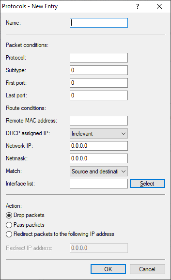 | Name | DHCP-Src-MAC | Dest-MAC-Addr. | Prot. | IP address | IP network | Subtype | First port | Last port | Interface list | Action | Redirect IP address |
