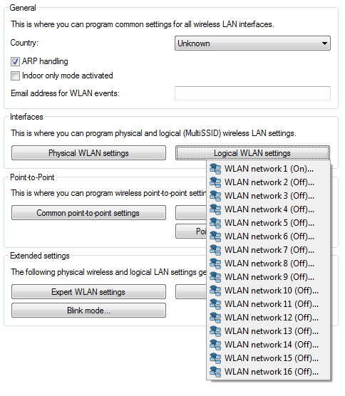 Every physical WLAN interface can support up to 16 different logical cellular networks (Multi-SSID). Parameters can be defined specifically for each of these networks, without the need of additional access points.