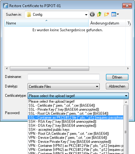 SSL certificate chains can be loaded into the device as a PKCS#12 container. These certificate chains can be used for Public Spot authentication pages by using the HTTPS server implemented in the device. Certificates from recognized trust centers are normally multi-level. Officially signed certificates in the Public Spot are necessary to avoid certificate-related error messages from the browser when authenticating at a Public Spot.