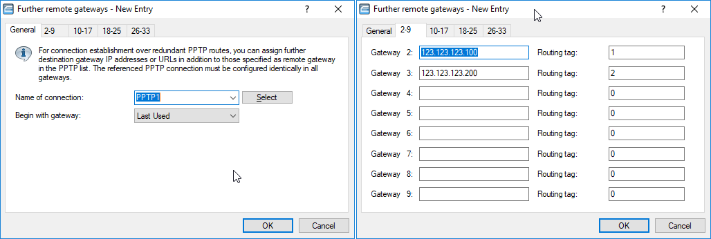 Note: If you do not specify a routing tag here (i.e. routing tag is 0), then the routing tag configured for this remote site in the PPTP connection list will be taken for the associated gateway.