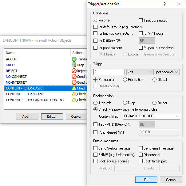 A content-filter related firewall rule must contain a special action object that uses packet actions to check the data according to a content-filter profile. In the default configuration you will find the action objects CONTENT-FILTER-BASIC, CONTENT-FILTER-WORK and CONTENT-FILTER-PARENTAL-CONTROL, each of which refer to their corresponding content-filter profile: