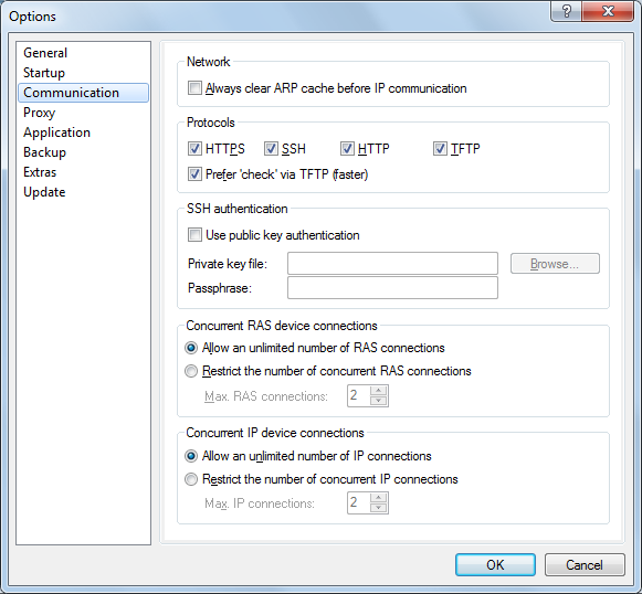 - If you have selected the SSH protocol, you can alternatively perform the authentication via a private key. In this case, the authentication dialog for password entry is not invoked. If you select Use public key authentication, enter the path to your private key file into the field, and, if necessary, the passphrase that you used to encrypt the file. Load the corresponding public key with LANconfig or WEBconfig onto each device.For detailed instructions about configuring the public-key authentication for your devices, see chapter SSH authentication using a public key.