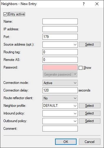 Note: If the active connection setup does not succeed, a new attempt is made after 120 seconds. - Passive: In this mode the device does not actively connect to the BGP neighbor; instead, it waits for a connection request from the BGP neighbor.