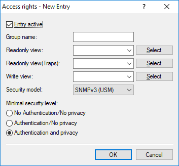 For SNMPv1 or SNMPv2c, you force the entry of login data for SNMP read-only access by disabling the public community in the list of the SNMP communities. This setting only allows information about the state of the device, current connections, reports, etc., to be read out via SNMP after the user authenticates at the device. Authorization can be conducted either with the administrator-account access credentials or an access account created for the individual SNMP community.