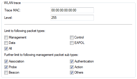 - Similar to Trace MAC and Trace level, the output from WLAN DATA traces can be restricted by the type of packet sent or received, e.g. management (authenticate, association, action, probe-request/response), control (e.g. powersave poll), EAPOL (802.1X negotiation, WPA key handshake).