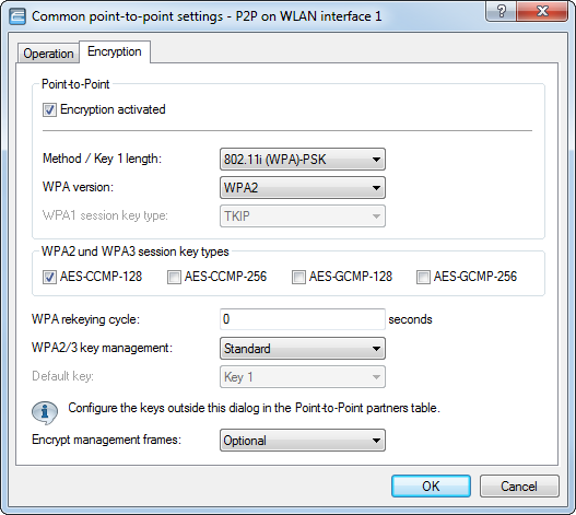 To encrypt management frames between the base stations of a P2P WLAN bridge, in LANconfig you navigate to , open the P2P configuration of the appropriate WLAN interface, switch to the Encryption tab, and click the appropriate option in the selection list Encrypt management frames.