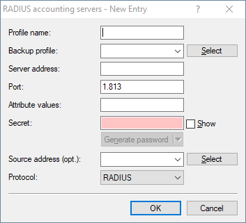 - Enter the key (shared secret) for access to the accounting server here. Ensure that this key is consistent with that specified in the accounting server.