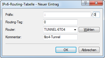 27. Im Feld Router wählen Sie aus der Liste den Namen des Tunnels aus, den Sie definiert haben, im Beispiel oben "TUNNEL-6TO4".
