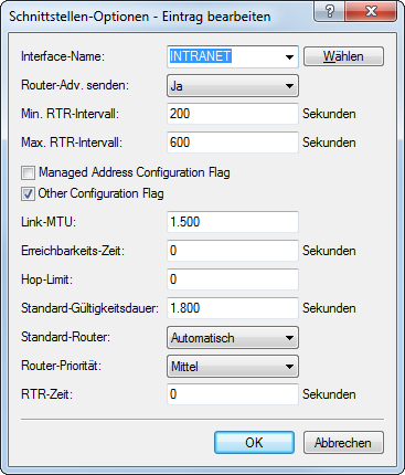 19. Im Verzeichnis IPv6 > Router-Advertisements öffnen Sie die Schnittstellen-Optionen und klicken auf Bearbeiten für den Eintrag INTRANET.