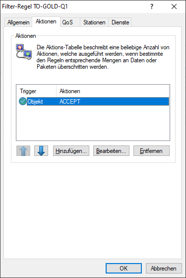 - Danach fügen Sie auf dem Reiter Aktionen eine "ACCEPT"-Aktion hinzu und entfernen die voreingestellte "REJECT"-Aktion.