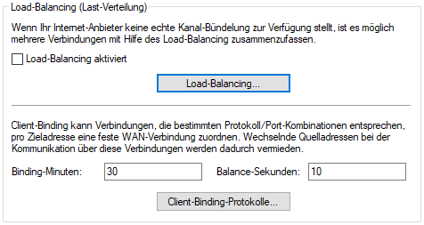 Client-Binding kann Verbindungen, die bestimmten Protokoll- / Port-Kombinationen entsprechen, pro Zieladresse eine feste WAN-Verbindung zuordnen. Wechselnde Quelladressen bei der Kommunikation über diese Verbindungen werden dadurch vermieden. Das Client-Binding wird beim Load-Balancing ggf. aktiviert.