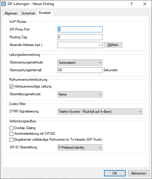Auf dem Reiter Erweitert konfigurieren Sie den SIP-Proxy, die Leitungsüberwachung sowie die Rufnummernunterdrückung.