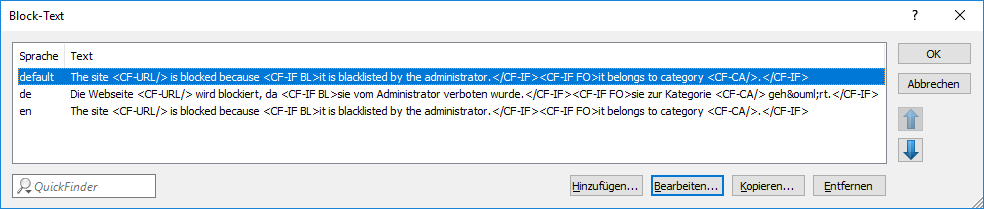 Hier können Sie einen Text definieren, der bei Blockierung angezeigt wird. Für unterschiedliche Sprachen kann jeweils ein eigener Block-Text definiert wird. Die Auswahl des verwendeten Block-Textes wird anhand der übermittelten Spracheinstellung des Browsers (User Agents) vorgenommen.