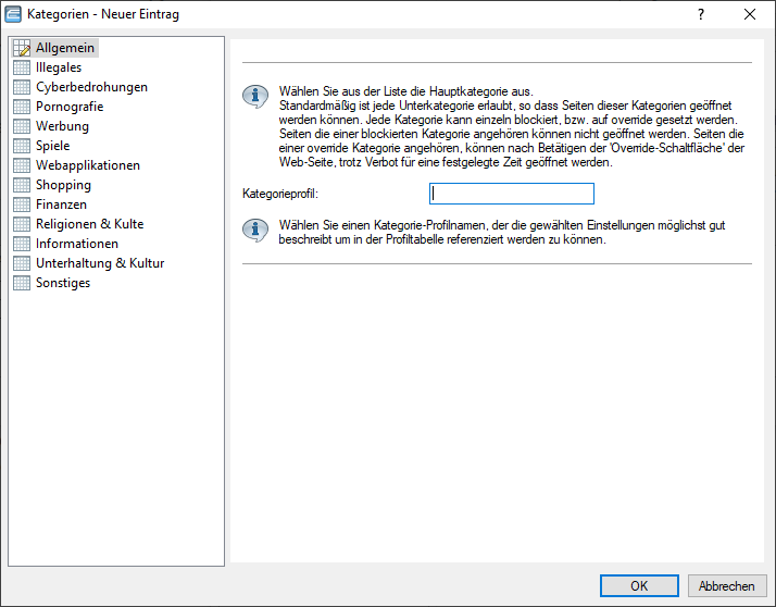 Hier erstellen Sie ein Kategorieprofil und legen fest, welche Kategorien bzw. Gruppen bei der Bewertung der Webseiten berücksichtigt werden. Für jede Gruppe können Sie die einzelnen Kategorien erlauben, verbieten oder die Override-Funktion aktivieren.