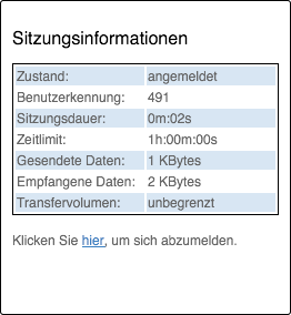 Das Fenster mit den Sitzungsinformationen aktualisiert sich automatisch regelmäßig. Neben Zustand und verwendeter Benutzerkennung sind vor allem die angebotenen Informationen über Verbindungszeit und übertragenes Datenvolumen von Interesse.