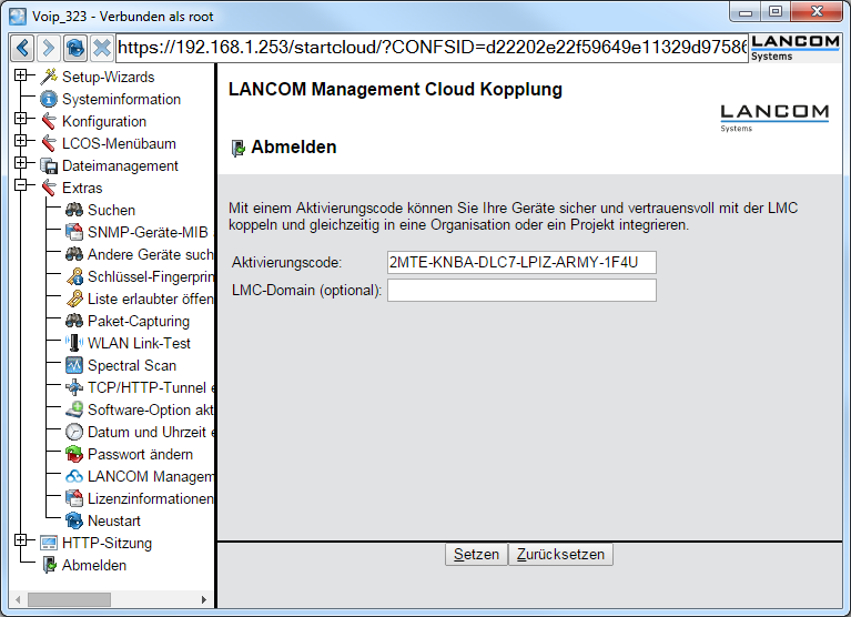 2. Geben Sie unter Extras > LANCOM Management Cloud Kopplung Ihren Aktivierungscode ein.