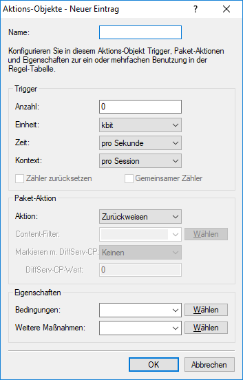 - Bestimmt, welche Trigger-Aktionen die Firewall zusätzlich zur Filterung der Datenpakete starten soll. Die Trigger-Aktionen können Sie unter Weitere Maßnahmen definieren.