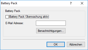 Klicken Sie auf die Schaltfläche Battery Pack und aktivieren Sie die Checkbox Battery Pack-Überwachung aktiv. Definieren Sie eine gültige E‑Mail Adresse für die Übermittlung von Statusmeldungen.