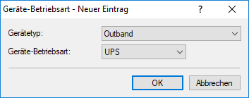 Wählen Sie für den Betrieb als Gerätetyp die Einstellung "Outband" und als Gerätebetriebsart "UPS" (Uninterruptable Power Supply) aus. Diese Betriebsart stellt sicher, dass der Status des angeschlossenen Battery Packs abgefragt werden kann.