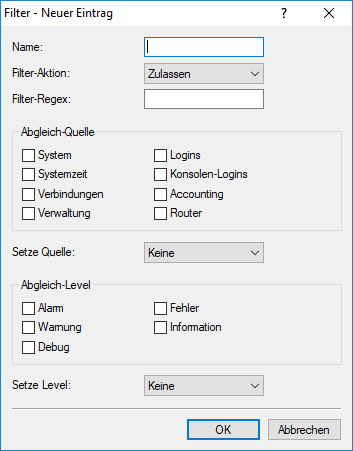 Werden die Syslog-Meldungen an einen oder mehrere Server übertragen, indem Einstellungen für den Empfang bestimmter Meldungen konfiguriert wurden, so werden alle konfigurierten Meldungen mit der konfigurierten Quelle und Priorität an die Server übertragen. Mitunter ist es jedoch wünschenswert, bestimmte Meldungen für die Server auszufiltern, nur bestimmte Meldungen überhaupt zu schicken oder auch deren Quelle und Priorität zu verändern, falls sie im Serverlog eine andere Gewichtung erhalten sollen. Der Syslog-Filter erlaubt es, Meldungen in Abhängigkeit von Quelle, Priorität und / oder Meldungstext zu filtern. Konfigurieren Sie hier diese Filter, die Sie dann bei Einträgen des SYSLOG-Servers verwenden können.