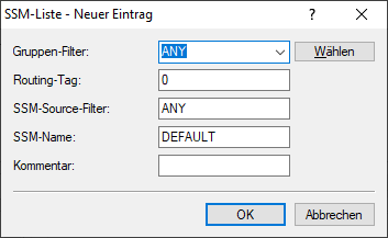 - Definiert den SSM-Source-Filter für diesen Tabellen-Eintrag. Nur Multicast-Quell-Adressen, die auf den SSM-Source-Filter passen, werden auf diese SSM-Konfiguration angewendet. Referenziert eine Filterliste aus der Tabelle .