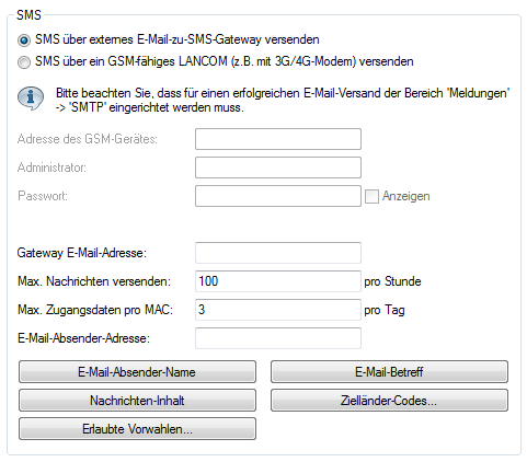 Wichtig: Für den erfolgreichen Versand der Anmeldedaten als Kurznachricht durch ein 3G/4G WWAN-fähiges Gerät muss unter Meldungen > SMS-Nachrichten dessen internes SMS-Modul eingerichtet sein, siehe Basiskonfiguration des SMS-Moduls.