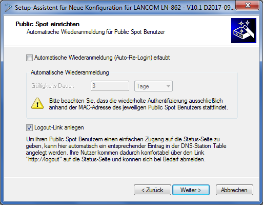 Legen Sie fest, ob für sämtliche Public Spot-Nutzer eine automatische Wiederanmeldung erlaubt ist und welche welche maximale Abwesenheit dafür zulässig ist, bevor sich der Nutzer erneut über die Public Spot-Webseite anmelden muss. Klicken Sie anschließend auf Weiter.