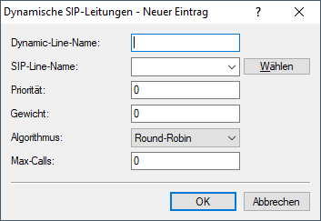 - Geben Sie hier den Namen der dynamischen Leitung an. Besteht die dynamische Leitung aus mehreren physikalischen Leitungen, verwenden Sie diesen dynamischen Leitungsnamen ebenfalls bei weiteren Tabelleneinträgen.Dieser dynamische Leitungsname kann später in der Callrouting Tabelle als Ziel-Leitung verwendet werden.